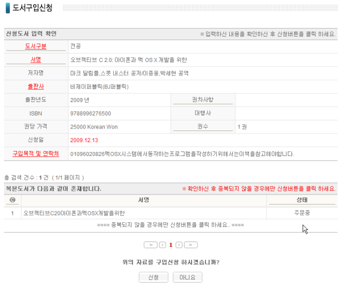 도서구입 신청하다가 중복으로 주문을 하게 되면 위의 이미지처럼 중복되었다고 출력됩니다. 확인을 하고 다르다면 신청을 같다면 아니요를 눌러주세요. 중복 도서를 신청하게되면 필요이상의 비용이 낭비가 됩니다.