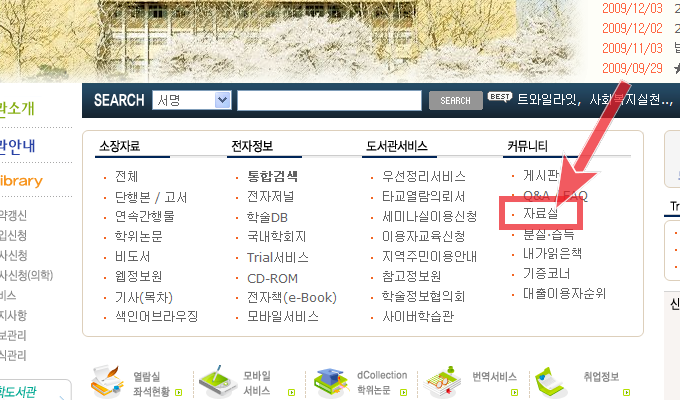 ※ 외국서적을 신청하기 위해서는 다음과 같은 절차를 밟아서 문서를 작성해주셔야합니다. 먼저 도서관사이트로 접속합니다.