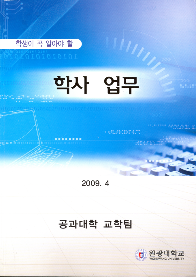 공과대학에서는 신입생을 위한 '학생들이 꼭 알아야할 학사 업무' 에 대한 교육을 실시하고 있습니다. 이 교육을 통해 학사 과정이 어떻게 진행되는 지, 그리고 학사 일정이 어떻게 되는지 배워야 합니다. 이 책자는 무료로 배포되고 있으며 상단의 주소와 같이 인터넷 WUPIS 의 주요학사안내의 내용과 일치합니다. 이 책자의 목차 구성으로는