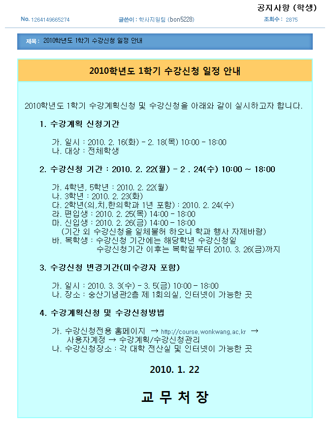 2010년도 부터는 수강신청일정이 많이 변경되었습니다. 신입생 및 복학생의 불이익을 최소화하기 위해서 기간을 변경하는 것으로 알고 있습니다. 사전에 수강신청 계획기간 및 신청기간을 잘 숙지하여 불이익이 없도록 합시다. http://cyber.wonkwang.ac.kr/Cyber/ComBoard_V005/Content/print.jsp?gid=1115983888724&bid=1115985252888&cid=1264149665274