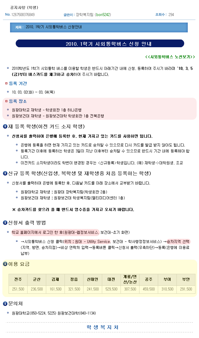 시외통학버스 노선 보기 링크 (사전에 반드시 확인하시고 신청하십시오) : http://www.wonkwang.ac.kr/include/template.shtml?level1=3&level2=8&level3=0&ct=/organ/bon/janghak/ct_bac_06.6.1.html