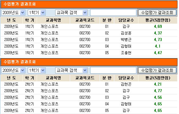 이 문서는 "2009학년도" 교양 스포츠 과목 수업평가 결과를 캡쳐한 문서입니다. 이 문서가 수업평가의 모든 기준이 될 수 없습니다. 그러나 가장 중요한 참고 문서가 될 수 있습니다. 위의 이미지 자료를 참고하여 추후의 수강계획 및 수강신청에 많은 도움이 되길 바랍니다. 이 문서에 포함되어 있는 교수님 명단입니다. ;) (가나다순)