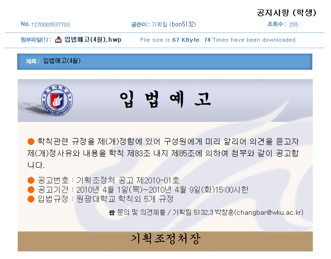 학칙관련 규정을 제(개)정함에 있어 구성원에게 미리 알리어 의견을 듣고자 제(개)정사유와 내용을 학칙 제83조 내지 제85조에 의하여 첨부와 같이 공고합니다. 공고번호 : 기획조정처 공고 제2010-01호 / 공고기간 : 2010년 4월 1일(목)~2010년 4월 9일(화)15:00시한 / 입법규정 : 원광대학교 학칙외 5개 규정