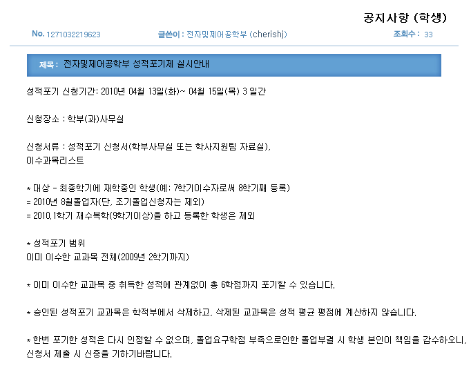 성적포기 신청기간: 2010년 04월 13일(화)~ 04월 15일(목) 3 일간 신청장소 : 학부(과)사무실 신청서류 : 성적포기 신청서(학부사무실 또는 학사지원팀 자료실), 이수과목리스트 * 대상 - 최종학기에 재학중인 학생(예: 7학기이수자로써 8학기째 등록) = 2010년 8월졸업자(단, 조기졸업신청자는 제외) = 2010.1학기 재수복학(9학기이상)을 하고 등록한 학생은 제외 * 성적포기 범위 이미 이수한 교과목 전체(2009년 2학기까지) * 이미 이수한 교과목 중 취득한 성적에 관계없이 총 6학점까지 포기할 수 있습니다. * 승인된 성적포기 교과목은 학적부에서 삭제하고, 삭제된 교과목은 성적 평균 평점에 계산하지 않습니다. * 한번 포기한 성적은 다시 인정할 수 없으며, 졸업요구학점 부족으로인한 졸업부결 시 학생 본인이 책임을 감수하오니, 신청서 제출 시 신중을 기하기바랍니다.