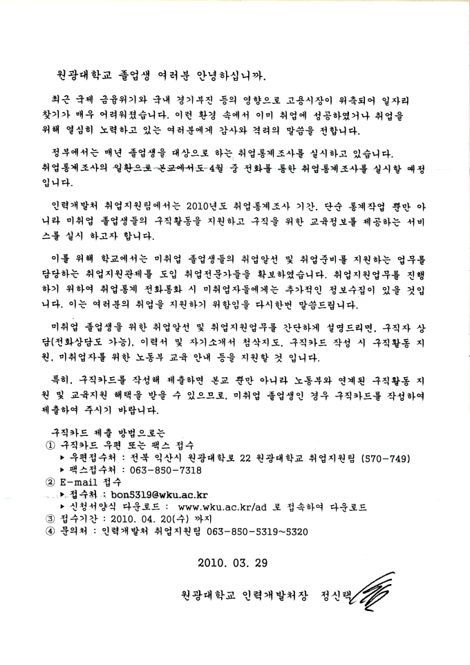 본문 일부 : 원광대학교 졸업생 여러분 안녕하십니까. 최근 국제 금융위기와 국내 경기부진 등의 영향으로 고용시장이 위축되어 일자리 찾기가 매우 어려워졌습니다. 이런 환경 속에서 이미 취업에 성공하였거나 취업을 위해 열심히 노력하고 있는 여러분에게 감사와 격려의 말씀을 전합니다. 정부에서는 매년 졸업생을 대상으로 하는 취업통계조사를 실시하고 있습니다. 취업통계조사의 일환으로 본교에서도 4월 중 전화를 통한 취업통계조사를 실시할 예정입니다. 인력개발처 취업지원팀에서는 2010년도 취업통계조사 기간, 단순 통계작업 뿐만 아니라 미취업 졸업생들의 구직활동을 지원하고 구직을 위한 교육정보를 제공하는 서비스를 실시 하고자 합니다. 이를 위해 학교에서는 미취업 졸업생들의 취업알선 및 취업준비를 지원하는 업무를 담당하는 취업지원관제를 도입 취업전문가들을 확보하였습니다. 취업지원업무를 진행하기 위하여 취업통계 전화통화 시 미취업자들에게는 추가적인 정보수집이 있을 것입니다. 이는 여러분의 취업을 지원하기 위함임을 다시한번 말씀드립니다. 미취업 졸업생을 위한 취업알선 및 취업지원업무를 간단하게 설명드리면, 구직자 상담(전화상담도 가능), 이력서 및 자기소개서 첨삭지도, 구직카드 작성 시 구직활동 지원, 미취업자를 위한 노동부 교육 안내 등을 지원할 것입니다. 특히 구직카드를 작성해 제출하면 본교 뿐만 아니라 노동부와 연계된 구직활동 지원 및 교육지원 해택을 받을 수 있으므로, 미취업 졸업생인 경우 구직카드를 작성하여 제출하여 주시기 바랍니다. 구직카드 제출 방법으로는 구직카드 우편 또는 팩스 접수, 이메일 접수 로 받으며 접수기간은 4월 20일까지, 문의처로는 인력개발처 취업지원팀 063 850 5319~5320 으로 문의해주시길 바랍니다. 원광대학교 인력개발처장 정신택 2010년 03월 29일