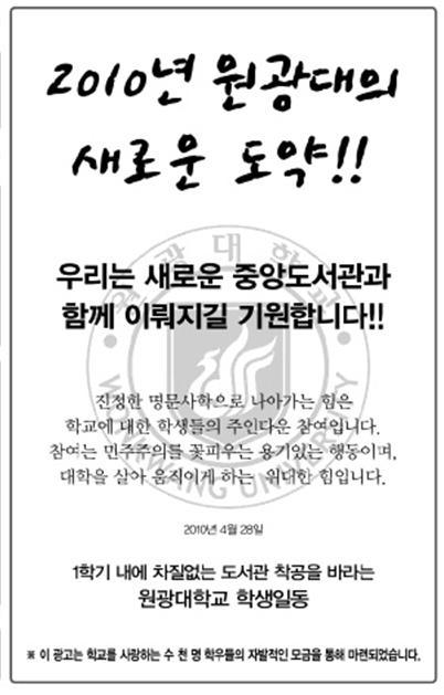 2010년 원광대의 새로운 도약!! 우리는 새로운 중앙도서관과 함께 이루어지길 기원합니다!! 진정한 명문사학으로 나아가는 힘은 학교에 대한 학생들의 주인다운 참여입니다. 참여는 민주주의를 꽃피우는 용기있는 행동이며, 대학을 살아 움직이게 하는 위대한 힘입니다. 2010년 4월 28일 1학기 내에 차질없는 도서관 착공을 바라는 원광대학교 학생일동 ※ 이 광고는 학교를 사랑하는 수 천 명 학우들의 자발적인 모금을 통해 마련되었습니다.