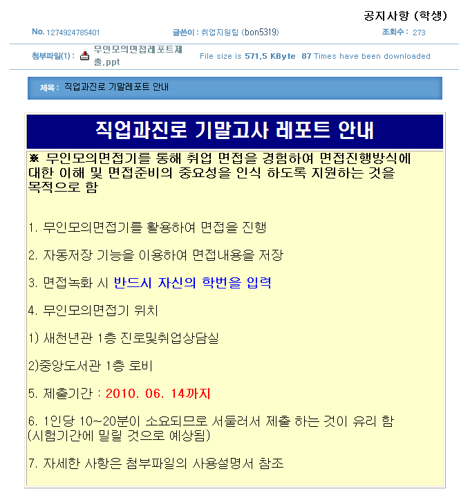 10' 중앙도서관, 셀프 면접 시스템 소개 및 직업과진로 기말고사 레포트 안내