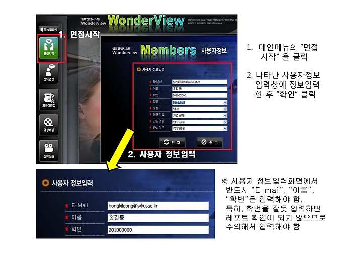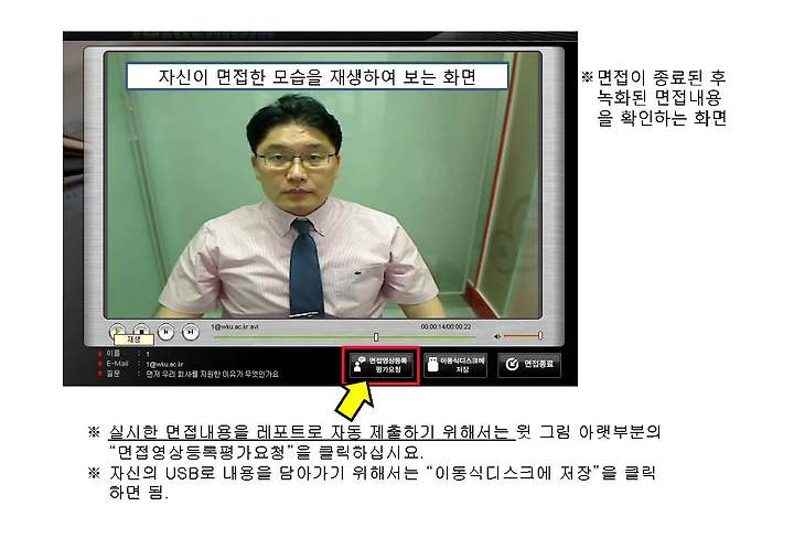 직업과 진로 기말고사 레포트 안내, 무인모의면접기를 통해 취업 면접을 경험하여 면접진행방식에 대한 이해 및 면접준비의 중요성을 인식 하도록 지원하는 것을 목적으로 함. 1. 무인모의면접기를 활용하여 면접을 진행 2. 자동저장 기능을 이용하여 면접내용을 저장 3. 면접녹화 시 반드시 자신의 학번을 입력 4. 무인모의면접기 위치 1) 새천년관 1층 진로및취업상담실 2)중앙도서관 1층 로비 5. 제출기간 : 2010. 06. 14까지 6. 1인당 10~20분이 소요되므로 서둘러서 제출 하는 것이 유리 함 (시험기간에 밀릴 것으로 예상됨) 7. 자세한 사항은 첨부파일의 사용설명서 참조