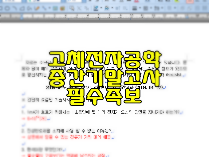 이 자료는 2007, 2008, 2009 교수님의 경향을 분석하고 누적된 정답을 종합하여 만든 족보입니다. 당대(?)의 최고의 지성을 가지는 몇몇 학생들의 지식과 교수님의 필기를 종합적으로 분류하고 정리하고 교정을 통하여 전자문서로 만들었습니다. 이 족보는 신홍규 교수님 고체전자공학의 시험의 기준이 될 수 있습니다. 하지만 절대적인건 아니니 단지 참고만 하십시오. 손으로 직접 4시간동안 타이핑을 하였기때문에 간혹 오타가 있을 수도 있으며 반드시 참고용으로만 활용하시길 바랍니다. 이것만 맹신하다가 발생되는 모든 문제의 책임은 운영자에게 없으며 전적으로 사용자에게 책임이 있음을 명시합니다. 관련 문의는 thisLMM@gmail.com