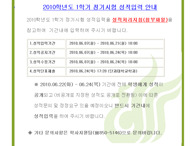 이 문서의 원본링크는 다음과 같습니다. 이 링크는 언제든지 깨질 수 있으니 참고바랍니다. http://webcms.wonkwang.ac.kr/servlet/kr.co.k2web.jwizard.contents.integratedboard.integratedboardUser.servlet.UserMainServlet?client_id=null&board_id=91&command=view&curPage=1&board_seq=157&sBoard_id=91&b_type=01 2010학년도 1학기 정기시험 성적입력 안내 2010학년도 1학기 정기시험 성적입력을 성적처리지침(첨부파일)을 참고하여 기간내에 입력하여 주시기 바랍니다. 1.성적입력기간 2010.06.07(월) - 2010.06.21(월) 18:00 2.성적공지기간 2010.06.07(월) - 2010.06.24(목) 18:00 3.성적수정기간 2010.06.07(월) - 2010.06.24(목) 18:00 4.성적단표제출 2010.06.24(목) 17:20 (단과대학교학과) ※ 2010.06.22(화) - 06.24(목) 기간에 전체 학생에게 성적이 공개되고 (비공개로 지정된 성적도 공개로 전환됨) 이에 따른 성적문의 및 정정요구 있을 예정이오니 반드시 기간내에 성적입력을 하여 주시기 바랍니다. 기타 문의사항은 학사지원팀(850-5146)으로 문의바랍니다. 2010.06.03 교무처장