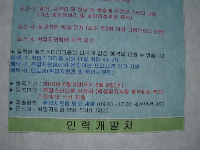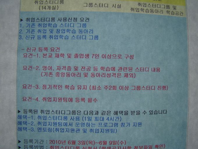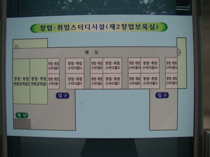 중앙도서관 지하 1층을 리모델링해서 만든 곳. 창업취업스터디시설(제2창업보육실) 이라고 명명되어 있으며 창업취업강의실 2실, 창어취업스터디룸이14실 등으로 존재한다. 각 취업스터디룸에 따라 크기가 제각기 다르다. 이용기간이 따로 있으며 2010학년도 하계방학기간은 6월 14일부터 8월 29일까지 사용가능, 시간은 09시부터 22시까지 가능하다. 사용신청을 해야사용할 수 있는데 이에 대한 요건은 1.기존 취업학습 스터디그룹, 2.기존 취업 및 창업학습 동아리, 3.신규 등록 취업학습 스터디 그룹 으로 되어 있다. 신규등록 요건이 중요한다. 본교재학및졸업생 7인이상으로 반드시 구성되어야하고, 영어,자격증및전공학습에 관련한 스터디 내용으로 스터디가 진행되어야한다. 최소 주2회이상의 그룹스터디가 진행되어야하고 취업지원팀에 등록은 필수적이다. 등록에 따른 해택은 취업스터디룸을 1일 최대 4시간 사용가능하고 취업지원팀에서 운영하는 프로그램에 참여할 수 있으며 멘토링 또한 지원받을 수 있다. 등록기간은 따로 두고 있으며 2010년 6월 3일~9일까지 약 1주일간 받는다 (상당히 짧은 기간이다) 제출 방법은 신청서를 작성하여 취업지원팀에 제출하고 승인을 받아야한다.