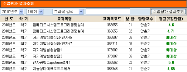 이 문서는 "2010학년도 1학기" 전자제어공학부 교수별 수업평가 결과 문서입니다. 수업평가가 모든 것의 기준이 될 수 없습니다. 그러나 가장 중요한 참고 자료가 될 수 있습니다. 반드시 아래의 문서를 참고하여 수강계획 및 수강신청에 많은 도움이 되시길 바랍니다. 아래의 명단은 전자제어공학부(http://www.wonkwang.ac.kr/organ/dae/elc/) 교수진소개를 참고하여 정렬하였습니다. 위의 이미지 자료는 일부 명단에 누락 될 수 있으니 꼼꼼하게 살펴보시길 바랍니다. 수업평가 조회는 다음의 주소에서 조회할 수 있습니다. http://intra.wonkwang.ac.kr/SWupis/V005/Service/Stud/Estimate/search.jsp 사용방법은 http://www.openbind.com/149 을 참고하여 수업평가 결과 조회를 유용하게 검색하도록 합시다.