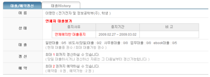 이 부분이 바로 대출 갱신 예약 조회 부분입니다. 책을 대출할 때 학사과정 학생의 경우 일반 대출 5권이 가능하며, 비도서당일대출일경우 2권까지 가능합니다. 대출기간은 15일 정도되며, 1번의 갱신을 통해 최대 30일까지 대출이 가능합니다. 그리고 대출이 연체가 될 경우(갱신을 하지 못하거나, 갱신기간을 초과한 경우) 하루가 연체 될때마다 대출불가기간이 1일씩 늘어나므로 연체가 되지 않도록 주의를 하도록 합시다. [관련링크] 여기서 갱신이란, 대출 기간을 연장하는 방법 을 말하며 한번의 갱신으로 15일간 더 갱신을 할 수 있습니다. 갱신 방법은 상단의 이미지를 참고하자면 도서 대출시 해당 항목에 '갱신' 이란 부분을 클릭하면 '갱신여부'를 묻는 창이 뜨게 되고 확인 버튼을 누르면 갱신을 할 수 있게 됩니다.