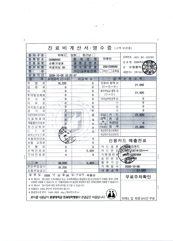 - 사본 영수증과 원본 영수증을 함께 가지고 가서 학생건강공제회에 제출하면 도장을 찍어주고 원본은 다시 돌려준다.