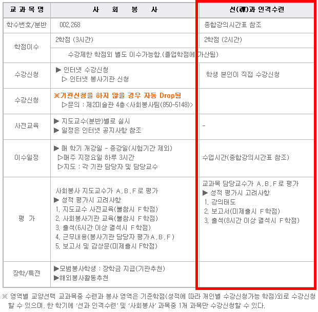 이 과목은 학점 외 학점 과목입니다. 사회봉사처럼 기관을 선택하는게 아니라 하나의 수업으로, 예를 들어 월12 또는 수12 처럼 2시간 동안 특정한 장소에서 수업을 받는 형식으로 진행합니다. 다음의 학사정보를 자세히 읽어보도록 합시다. 봉사활동처럼 성적 평가는 A,B,F로 평가 되며, 학점외 학점이기 때문에 졸업학점에만 부가 되는 것이지 해당 학기 성적 사정및 장학 사정에는 포함되지 않다는 것을 명심해주십시오.