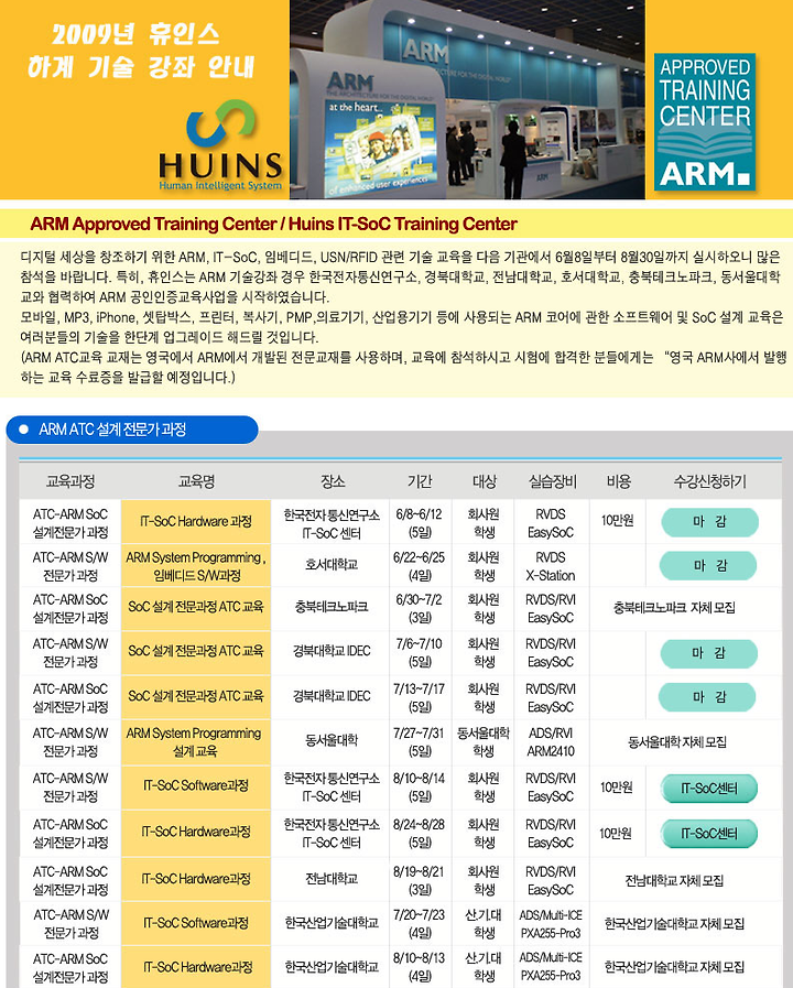 휴인즈에서 강의 신청하는 방법은 역시 두가지가 있는데 휴인즈 사이트를 접속하면 팝업이 출력됩니다. 아래의 이미지처럼 팝업이 출력되는데 ARM 강좌가 있고 더 내려보면 IT-SOC 강의가 있습니다. 경우에 따라 무료강의도 있고, 유료강의도 있습니다. 아마 제 생각에는 휴인즈에서 직접 제공하는 강의는 IT-SOC 강의인것 같습니다. 흠.. 시간이 이미 지나버렸군요. 어쨋거나 이렇게 팝업을 통해서 신청하는 방법이 있습니다. 물론 하계 동계만 있는게 아니라 학기 중에도 가끔 있으므로 수시로 들어와서 무료강의가 있는지 확인하는 방법도 좋은 방법일 것 같습니다.