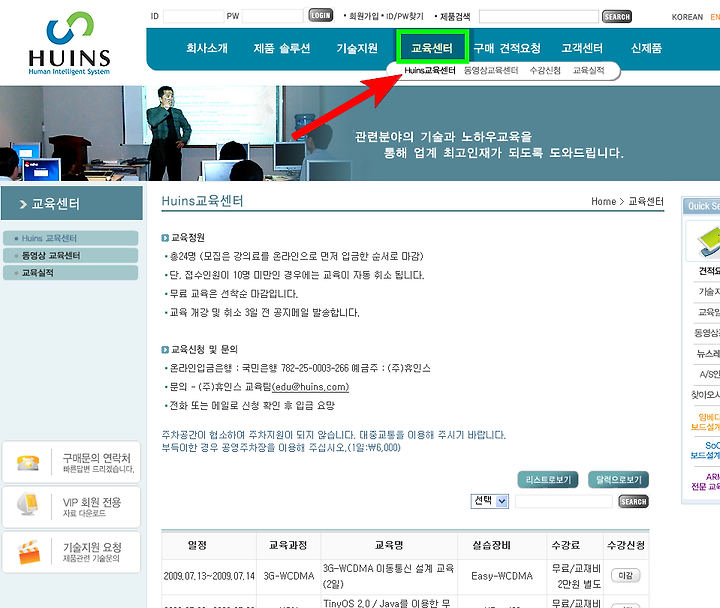 한백전자가 있다면 휴인즈라는 교육장비개발업체가 있습니다. 한백전자처럼 많은 개발장비 또는 교육장비를 제작하는 업체입니다. 휴인즈에서 이말을 들으면 기분 나쁠지는 모르겠지만 학생들에게는 한백전자라는 이름을 더 많이 들었을 것입니다. (죄송합니다.) 어쨋거나 휴인즈(http://www.huins.com/)도 한백전자와 같이 무료 강의를 시행합니다. 다만 그닥 많이 교육을 진행하지않는 것 같아 다소 아쉬운 면도 적잖아 있습니다. 그리고 한백전자에 비해 아쉬운 면이 있다면 교재비를 따로 받는다는 점이 조금 아쉽습니다.