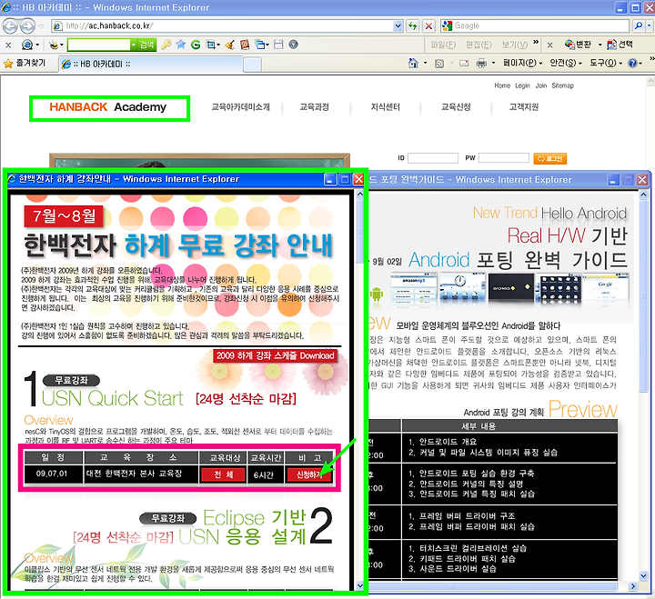 이 왼쪽 팝업만 유심히 지켜보십시오. 우측의 Andriod 포팅 완벽 가이드는 보시면 아시겠지만 "유료" 강좌입니다. 우리 학생들은 무료 강의를 집중적으로 보시면 될 것같습니다. 쭉한번 보시고 일정과 교육장소 그리고 교육대상을 매우 유심히 보십시오. 교육대상이 학생인가, 교수인가 그리고 장소는 언제인가 를 잘 보신 다음에 비고에서 '신청하기'를 누르면 됩니다. 내가 받을 교육에 대해 선정을 하셧다면 비고란의 "신청하기"를 클릭하십시오.