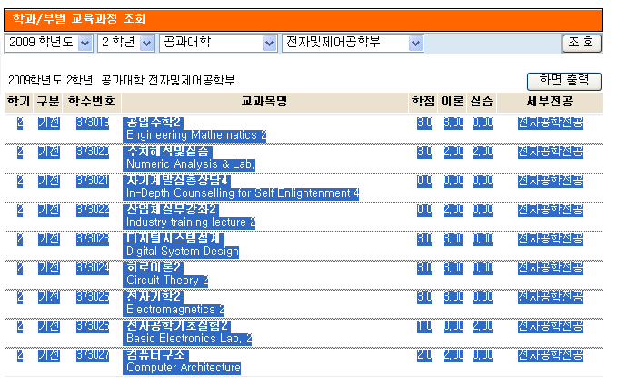 08학번은 2009년도 2학기 19학점 편성으로 인해 기존의 18학점 학생들은 수업을 계절학기 형식으로 하여 들을 수 밖에 없었습니다. 이번 교수님들의 긴급회의를 통해 교육과정을 기존의 08 교육과정에서 09 교육과정으로 갈아탔습니다. 따라서 08학번을 기준으로 교육과정을 검색할때 다음 이미지처럼 검색을 해야합니다.