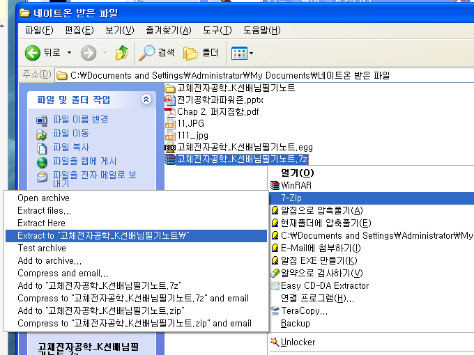 7z 파일형식은 7-zip 프로그램을 통해서 압축을 해제할 수 있습니다. 7zip은 무료입니다. http://www.7-zip.org/ 이곳에서 다운을 받을 수 있으며 강력한 7z 압축 기능을 제공합니다. 역시 7z 형식의 압축파일을 지정한 상태에서 오른쪽 버튼을 눌러 컨스트럭트 메뉴 활성시 Extract (압축 해제)가 가능합니다.