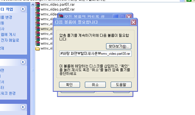 만약에 10개의 분할 압축 파일이 있다고 할 때 그중에 8번째 파일이 없다면 다음과 같은 이미지가 출력이 됩니다. 이때 부분적으로나마 압축이 풀리나 8번 파일 이후의 압축파일은 압축해제가 불가능하니 반드시 분할압축파일은 완벽히 있는 상태에서 압축을 해제하길 바랍니다.